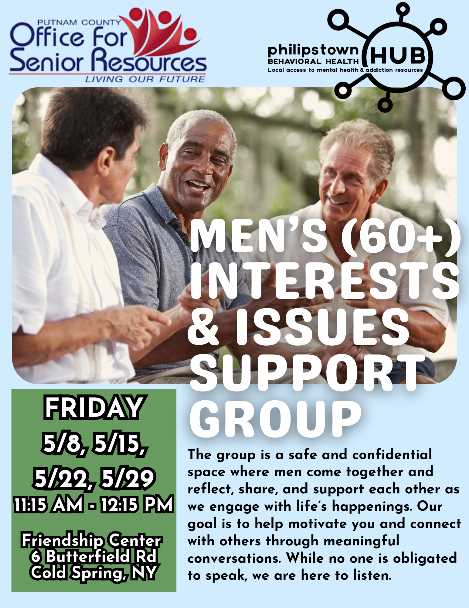 Mens Interests and Issues Focus Group (60+) Friday, May 29, 2026 11:15 AM 12:15 PM 11:15 12:15 Friendship Center 6 Butterfield Road Cold Spring, NY United States (map) Google Calendar ICS