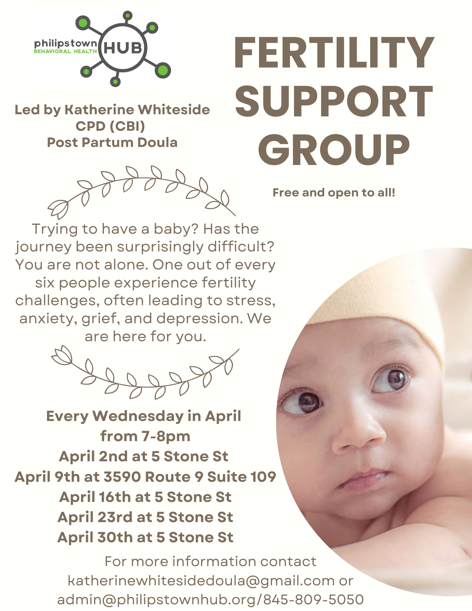 Fertility Support Group Wednesday, April 30, 2025 7:00 PM 8:00 PM Philipstown Behavioral Health Hub 5 Stone Street Cold Spring, NY, 10516 United States (map) Google Calendar ICS