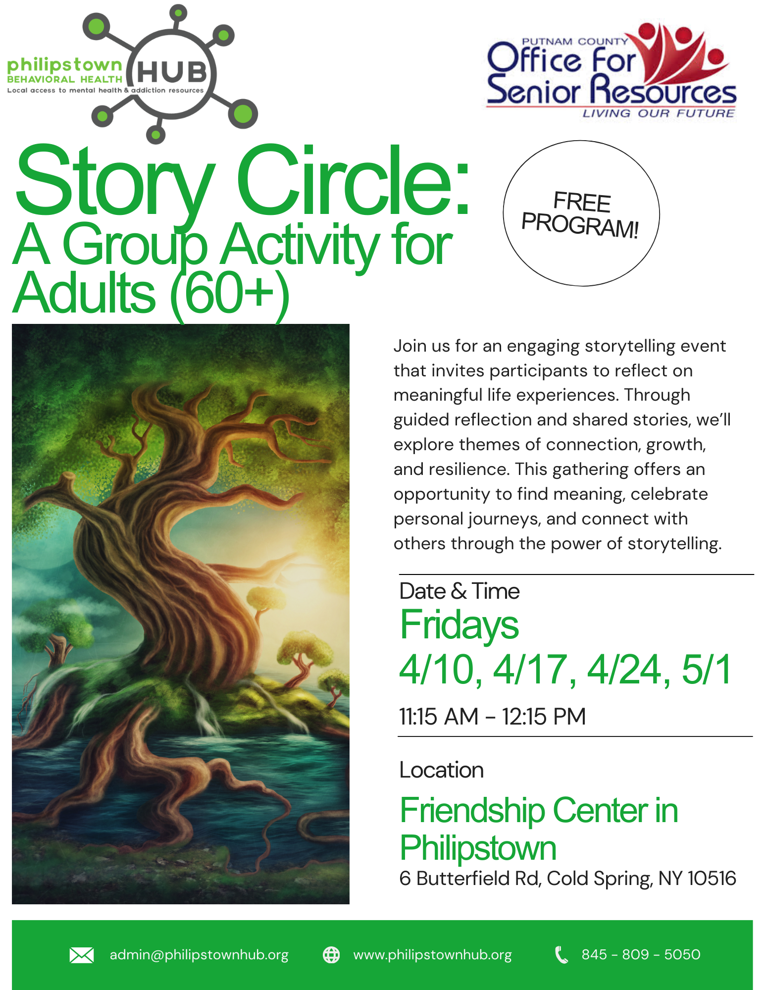 Story Circle: A Group Activity for Older Adults (60+) Friday, April 17, 2026 11:15 AM 12:15 PM 11:15 12:15 Friendship Center 6 Butterfield Road Cold Spring, NY United States (map) Google Calendar ICS